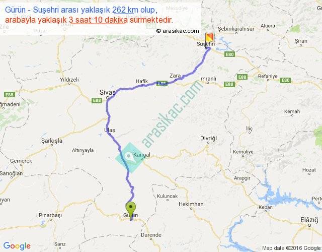 Gürün - Suşehri arası yaklaşık olarak 90 km/h ile yukarıda belirtilen sürede olup, iki yerin kuş uçuşu uzaklığı (mesafesi) 174'dir. Yolculuk otobüsle 4 saat 7 dakika sürmektedir.