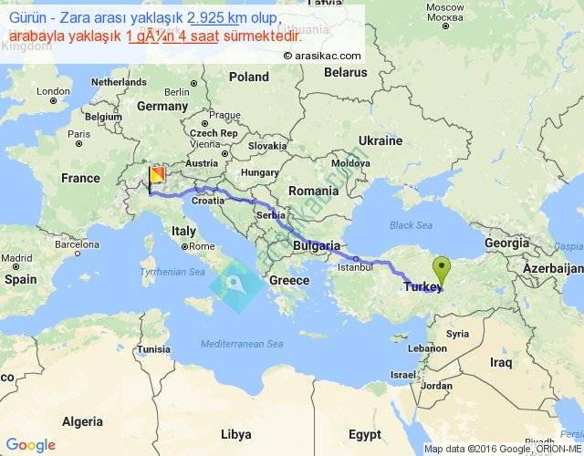 Gürün - Zara arası yaklaşık olarak 90 km/h ile yukarıda belirtilen sürede olup, iki yerin kuş uçuşu uzaklığı (mesafesi) 2407'dir. Eğer belirtilen yerler arasında uçak seferi var ise bu süre uçakla 3 saat 42 dakika'ya kadar düşebilir. Yolculuk otobüsle 1 gün 12 saat sürmektedir.