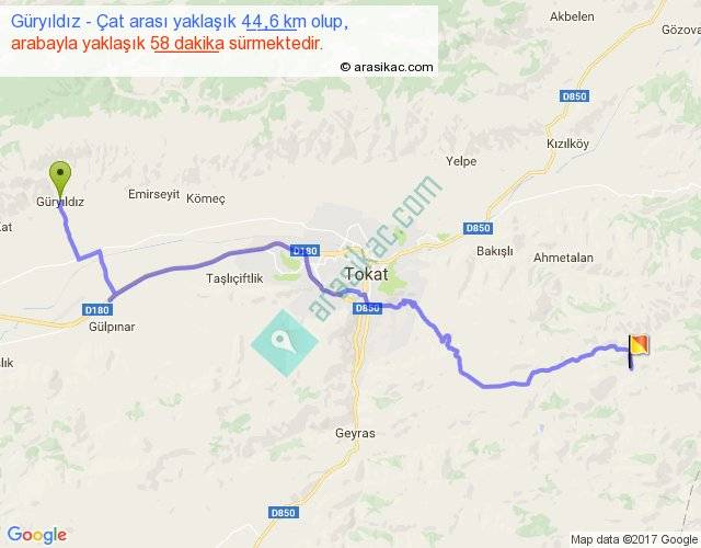 Güryıldız - Çat arası yaklaşık olarak 90 km/h ile yukarıda belirtilen sürede olup, iki yerin kuş uçuşu uzaklığı (mesafesi) 31'dir. Yolculuk otobüsle 1 saat 15 dakika sürmektedir.