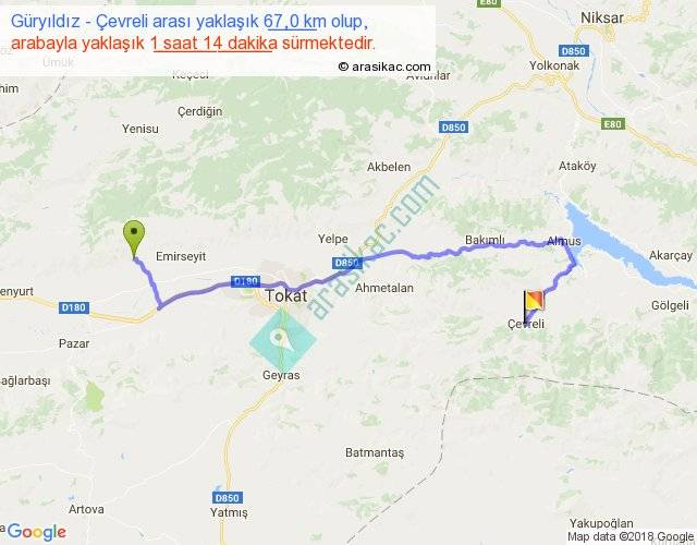Güryıldız - Çevreli arası yaklaşık olarak 90 km/h ile yukarıda belirtilen sürede olup, iki yerin kuş uçuşu uzaklığı (mesafesi) 42'dir. Yolculuk otobüsle 1 saat 36 dakika sürmektedir.