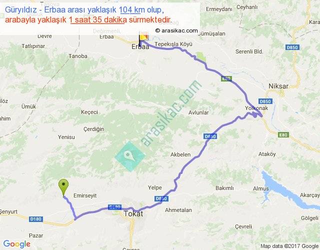 Güryıldız - Erbaa arası yaklaşık olarak 90 km/h ile yukarıda belirtilen sürede olup, iki yerin kuş uçuşu uzaklığı (mesafesi) 39'dir. Yolculuk otobüsle 2 saat 3 dakika sürmektedir.