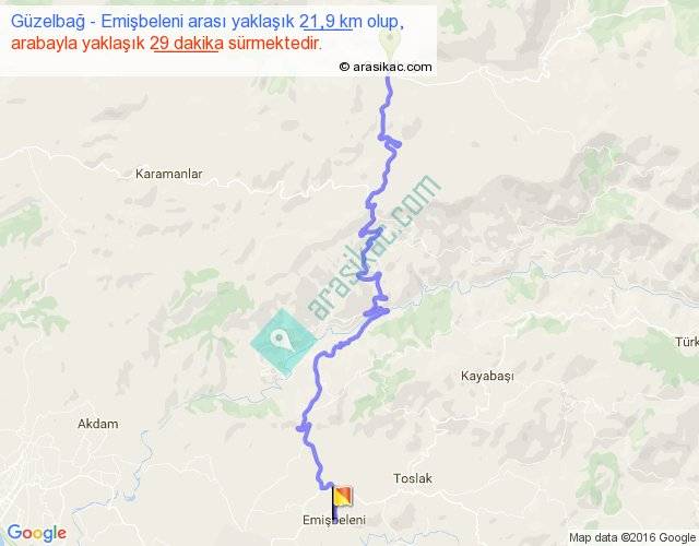Güzelbağ - Emişbeleni arası yaklaşık olarak 90 km/h ile yukarıda belirtilen sürede olup, iki yerin kuş uçuşu uzaklığı (mesafesi) 13'dir. Yolculuk otobüsle 37 dakika sürmektedir.