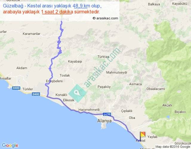 Güzelbağ - Kestel arası yaklaşık olarak 90 km/h ile yukarıda belirtilen sürede olup, iki yerin kuş uçuşu uzaklığı (mesafesi) 30'dir. Yolculuk otobüsle 1 saat 20 dakika sürmektedir.