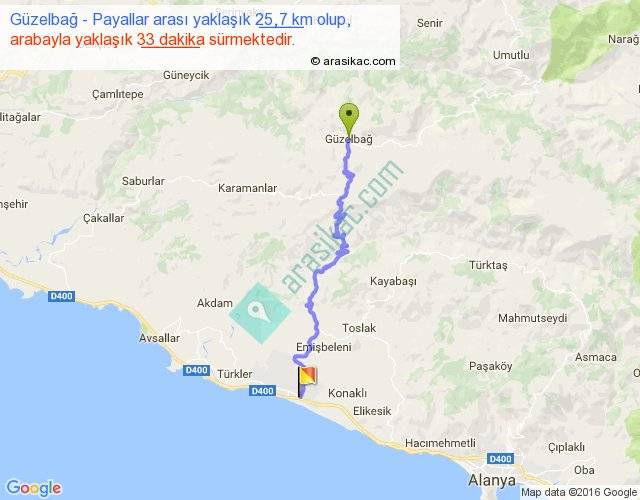 Güzelbağ - Payallar arası yaklaşık olarak 90 km/h ile yukarıda belirtilen sürede olup, iki yerin kuş uçuşu uzaklığı (mesafesi) 16'dir. Yolculuk otobüsle 42 dakika sürmektedir.