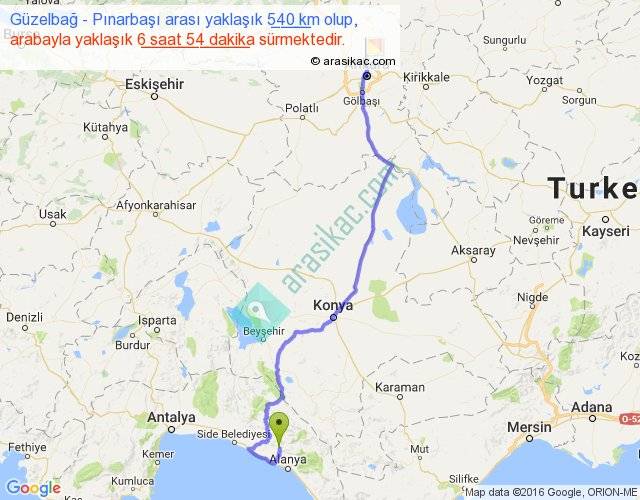Güzelbağ - Pınarbaşı arası yaklaşık olarak 90 km/h ile yukarıda belirtilen sürede olup, iki yerin kuş uçuşu uzaklığı (mesafesi) 371'dir. Eğer belirtilen yerler arasında uçak seferi var ise bu süre uçakla 34 dakika'ya kadar düşebilir. Yolculuk otobüsle 8 saat 58 dakika sürmektedir.
