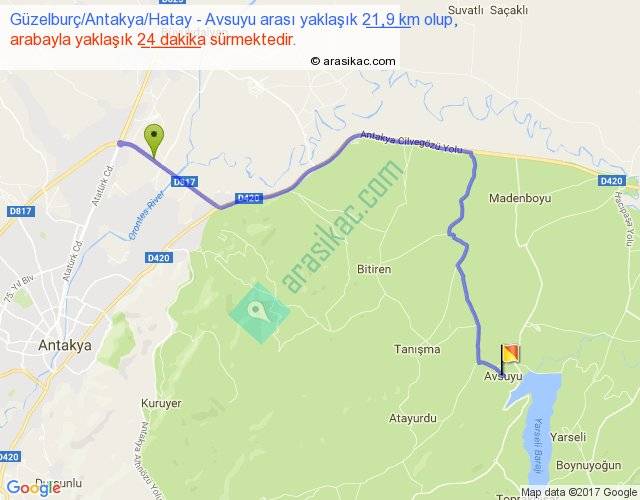 Güzelburç Antakya Hatay - Avsuyu arası yaklaşık olarak 90 km/h ile yukarıda belirtilen sürede olup, iki yerin kuş uçuşu uzaklığı (mesafesi) 13'dir. Yolculuk otobüsle 31 dakika sürmektedir.