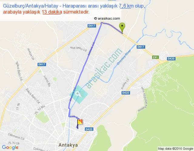 Güzelburç Antakya Hatay - Haraparası arası yaklaşık olarak 90 km/h ile yukarıda belirtilen sürede olup, iki yerin kuş uçuşu uzaklığı (mesafesi) 5'dir. Yolculuk otobüsle 16 dakika sürmektedir.