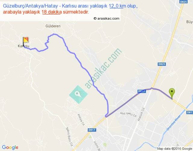 Güzelburç Antakya Hatay - Karlısu arası yaklaşık olarak 90 km/h ile yukarıda belirtilen sürede olup, iki yerin kuş uçuşu uzaklığı (mesafesi) 8'dir. Yolculuk otobüsle 23 dakika sürmektedir.