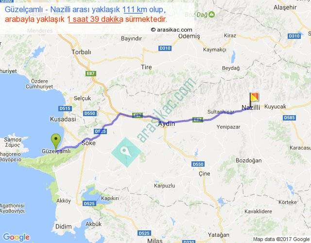 Güzelçamlı - Nazilli arası yaklaşık olarak 90 km/h ile yukarıda belirtilen sürede olup, iki yerin kuş uçuşu uzaklığı (mesafesi) 99'dir. Yolculuk otobüsle 2 saat 8 dakika sürmektedir.