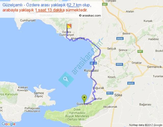 Güzelçamlı - Özdere arası yaklaşık olarak 90 km/h ile yukarıda belirtilen sürede olup, iki yerin kuş uçuşu uzaklığı (mesafesi) 35'dir. Yolculuk otobüsle 1 saat 34 dakika sürmektedir.