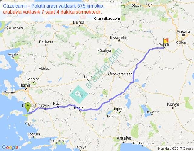 Güzelçamlı - Polatlı arası yaklaşık olarak 90 km/h ile yukarıda belirtilen sürede olup, iki yerin kuş uçuşu uzaklığı (mesafesi) 472'dir. Eğer belirtilen yerler arasında uçak seferi var ise bu süre uçakla 43 dakika'ya kadar düşebilir. Yolculuk otobüsle 9 saat 11 dakika sürmektedir.