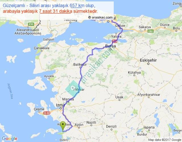 Güzelçamlı - Silivri arası yaklaşık olarak 90 km/h ile yukarıda belirtilen sürede olup, iki yerin kuş uçuşu uzaklığı (mesafesi) 381'dir. Eğer belirtilen yerler arasında uçak seferi var ise bu süre uçakla 35 dakika'ya kadar düşebilir. Yolculuk otobüsle 9 saat 46 dakika sürmektedir.
