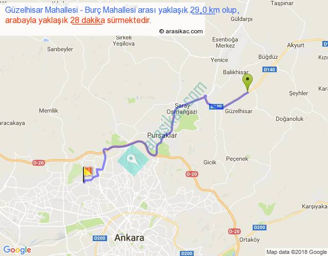 Güzelhisar Mahallesi - Burç Mahallesi arası yaklaşık olarak 90 km/h ile yukarıda belirtilen sürede olup, iki yerin kuş uçuşu uzaklığı (mesafesi) 21'dir. Yolculuk otobüsle 36 dakika sürmektedir.