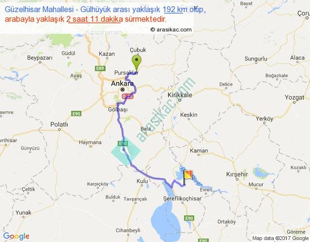 Güzelhisar Mahallesi - Gülhüyük arası yaklaşık olarak 90 km/h ile yukarıda belirtilen sürede olup, iki yerin kuş uçuşu uzaklığı (mesafesi) 119'dir. Yolculuk otobüsle 2 saat 50 dakika sürmektedir.