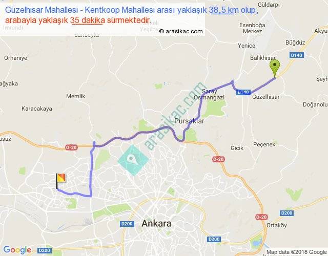 Güzelhisar Mahallesi - Kentkoop Mahallesi arası yaklaşık olarak 90 km/h ile yukarıda belirtilen sürede olup, iki yerin kuş uçuşu uzaklığı (mesafesi) 28'dir. Yolculuk otobüsle 45 dakika sürmektedir.