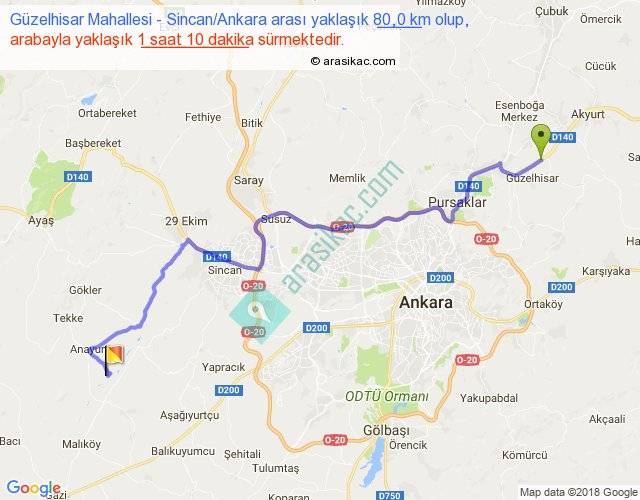 Güzelhisar Mahallesi - Sincan Ankara arası yaklaşık olarak 90 km/h ile yukarıda belirtilen sürede olup, iki yerin kuş uçuşu uzaklığı (mesafesi) 56'dir. Yolculuk otobüsle 1 saat 31 dakika sürmektedir.