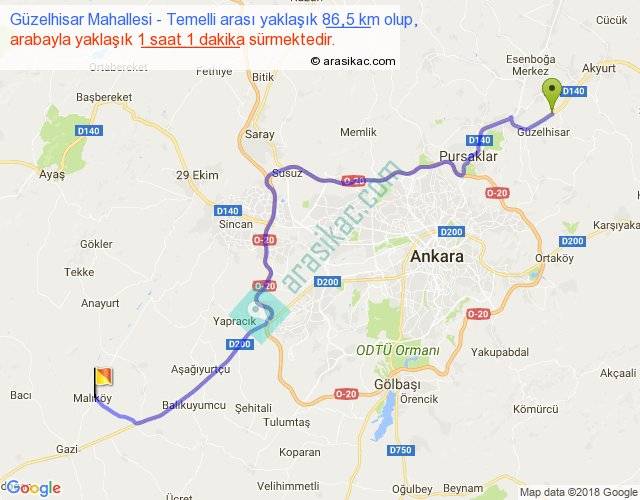 Güzelhisar Mahallesi - Temelli arası yaklaşık olarak 90 km/h ile yukarıda belirtilen sürede olup, iki yerin kuş uçuşu uzaklığı (mesafesi) 63'dir. Yolculuk otobüsle 1 saat 19 dakika sürmektedir.