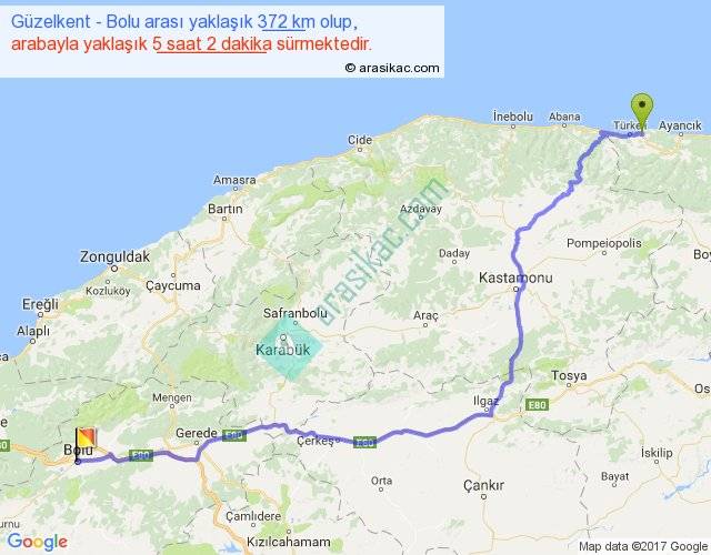 Güzelkent - Bolu arası yaklaşık olarak 90 km/h ile yukarıda belirtilen sürede olup, iki yerin kuş uçuşu uzaklığı (mesafesi) 268'dir. Eğer belirtilen yerler arasında uçak seferi var ise bu süre uçakla 24 dakika'ya kadar düşebilir. Yolculuk otobüsle 6 saat 32 dakika sürmektedir.
