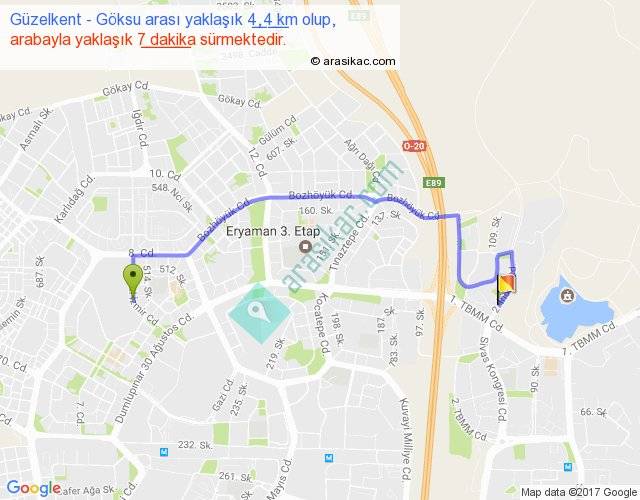 Güzelkent - Göksu arası yaklaşık olarak 90 km/h ile yukarıda belirtilen sürede olup, iki yerin kuş uçuşu uzaklığı (mesafesi) 3'dir. Yolculuk otobüsle 9 dakika sürmektedir.
