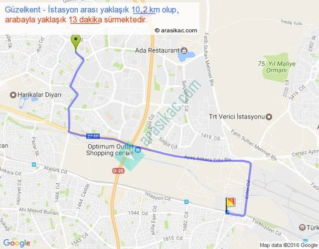 Güzelkent - İstasyon arası yaklaşık olarak 90 km/h ile yukarıda belirtilen sürede olup, iki yerin kuş uçuşu uzaklığı (mesafesi) 6'dir. Yolculuk otobüsle 16 dakika sürmektedir.