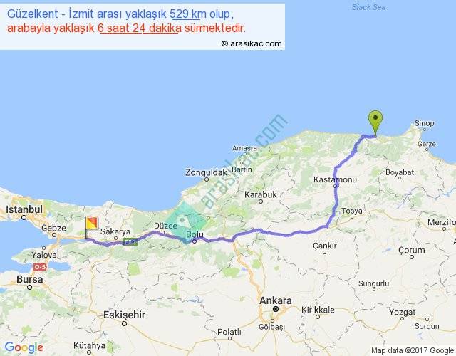 Güzelkent - İzmit arası yaklaşık olarak 90 km/h ile yukarıda belirtilen sürede olup, iki yerin kuş uçuşu uzaklığı (mesafesi) 392'dir. Eğer belirtilen yerler arasında uçak seferi var ise bu süre uçakla 36 dakika'ya kadar düşebilir. Yolculuk otobüsle 8 saat 19 dakika sürmektedir.