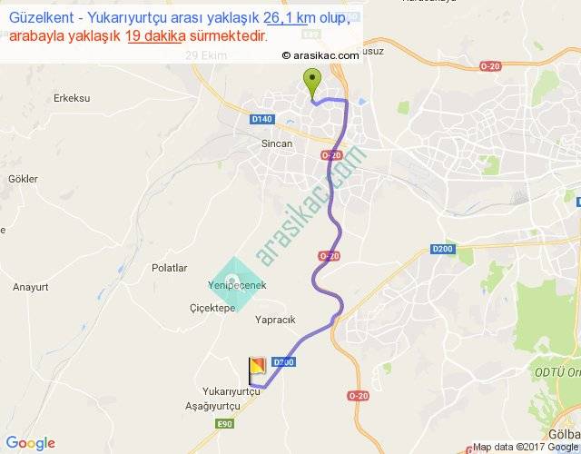 Güzelkent - Yukarıyurtçu arası yaklaşık olarak 90 km/h ile yukarıda belirtilen sürede olup, iki yerin kuş uçuşu uzaklığı (mesafesi) 19'dir. Yolculuk otobüsle 24 dakika sürmektedir.