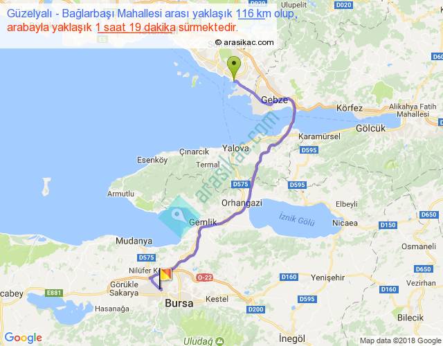 Güzelyalı - Bağlarbaşı Mahallesi arası yaklaşık olarak 90 km/h ile yukarıda belirtilen sürede olup, iki yerin kuş uçuşu uzaklığı (mesafesi) 74'dir. Yolculuk otobüsle 1 saat 42 dakika sürmektedir.