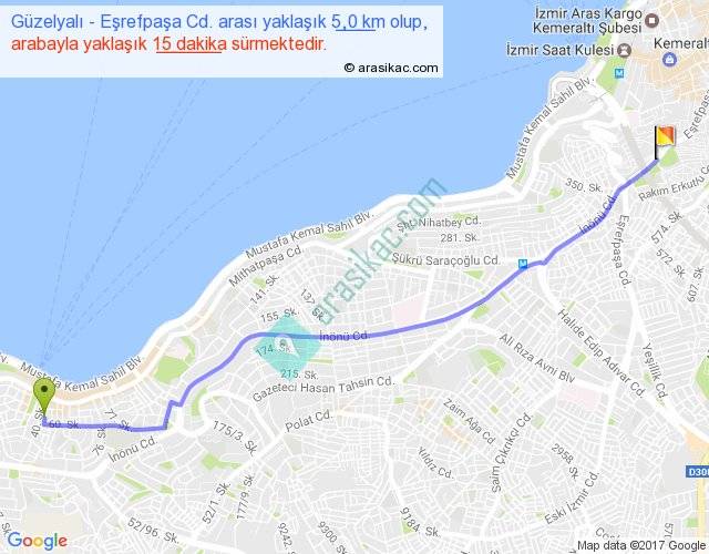 Eğer Güzelyalı Eşrefpaşa Cd. arası ne kadar yakar (benzin/mazot) diyorsanız, kilometrede 3 ₺ yakan bir aracınız var ise 15, km'de 4 ₺ yakan bir aracınız var ise 20, km'de 5 ₺ yakan bir aracınız var ise 25 ile bu yolculuğu tamamlayabilirsiniz.