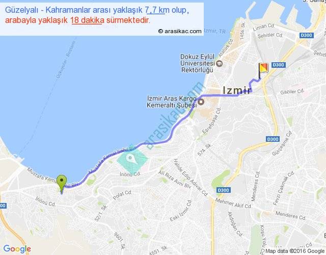 Güzelyalı - Kahramanlar arası yaklaşık olarak 90 km/h ile yukarıda belirtilen sürede olup, iki yerin kuş uçuşu uzaklığı (mesafesi) 7'dir. Yolculuk otobüsle 23 dakika sürmektedir.