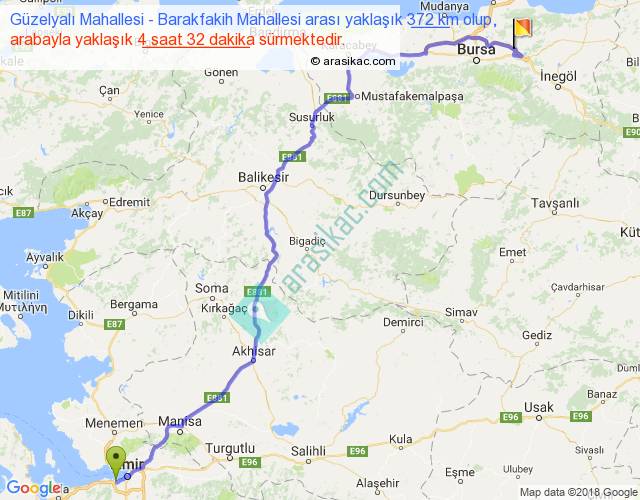 Güzelyalı Mahallesi - Barakfakih Mahallesi arası yaklaşık olarak 90 km/h ile yukarıda belirtilen sürede olup, iki yerin kuş uçuşu uzaklığı (mesafesi) 276'dir. Eğer belirtilen yerler arasında uçak seferi var ise bu süre uçakla 25 dakika'ya kadar düşebilir. Yolculuk otobüsle 5 saat 53 dakika sürmektedir.