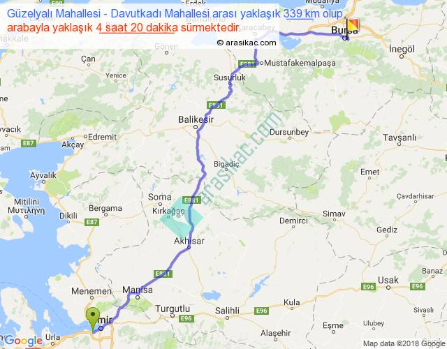 Güzelyalı Mahallesi - Davutkadı Mahallesi arası yaklaşık olarak 90 km/h ile yukarıda belirtilen sürede olup, iki yerin kuş uçuşu uzaklığı (mesafesi) 261'dir. Eğer belirtilen yerler arasında uçak seferi var ise bu süre uçakla 24 dakika'ya kadar düşebilir. Yolculuk otobüsle 5 saat 38 dakika sürmektedir.