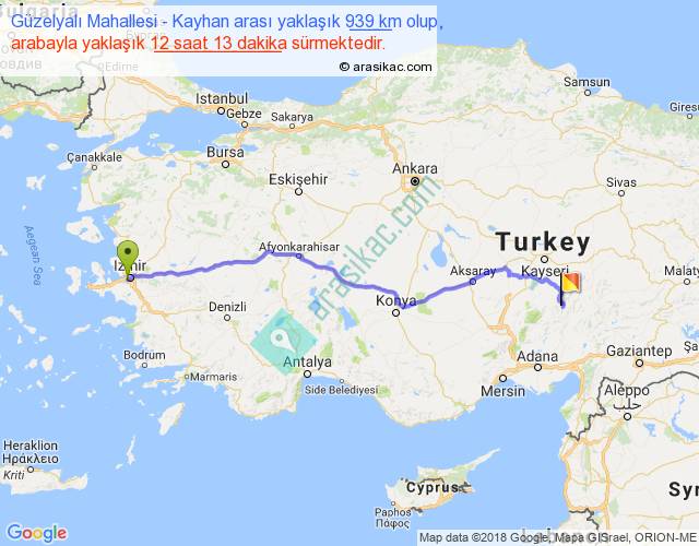 Güzelyalı Mahallesi - Kayhan arası yaklaşık olarak 90 km/h ile yukarıda belirtilen sürede olup, iki yerin kuş uçuşu uzaklığı (mesafesi) 762'dir. Eğer belirtilen yerler arasında uçak seferi var ise bu süre uçakla 1 saat 10 dakika'ya kadar düşebilir. Yolculuk otobüsle 15 saat 52 dakika sürmektedir.