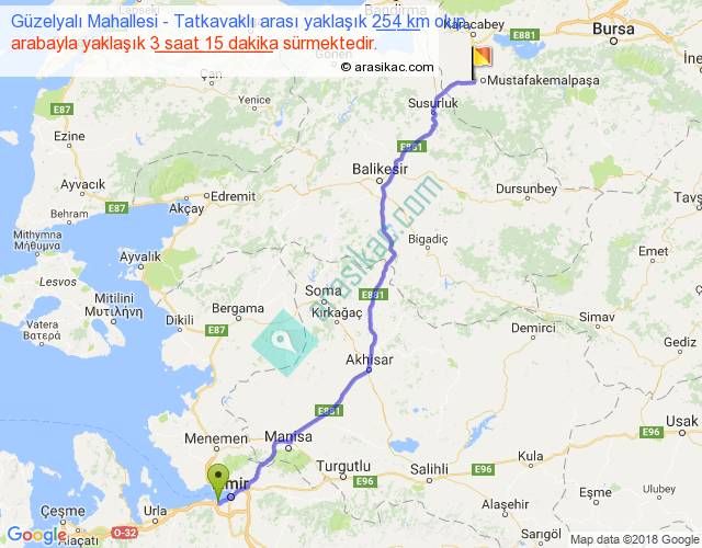 Güzelyalı Mahallesi - Tatkavaklı arası yaklaşık olarak 90 km/h ile yukarıda belirtilen sürede olup, iki yerin kuş uçuşu uzaklığı (mesafesi) 212'dir. Yolculuk otobüsle 4 saat 13 dakika sürmektedir.