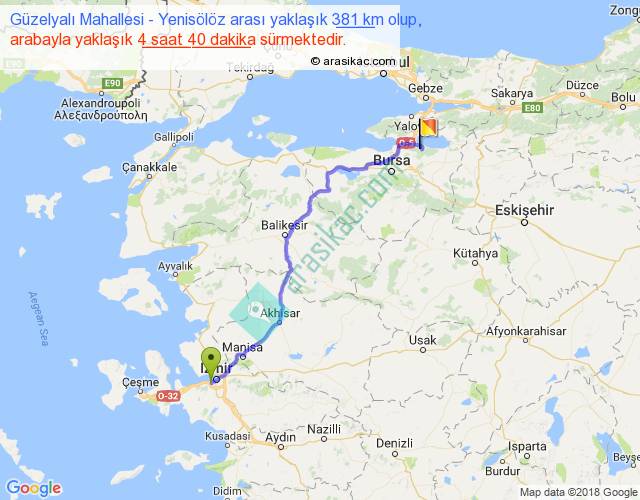 Güzelyalı Mahallesi - Yenisölöz arası yaklaşık olarak 90 km/h ile yukarıda belirtilen sürede olup, iki yerin kuş uçuşu uzaklığı (mesafesi) 295'dir. Eğer belirtilen yerler arasında uçak seferi var ise bu süre uçakla 27 dakika'ya kadar düşebilir. Yolculuk otobüsle 6 saat 4 dakika sürmektedir.
