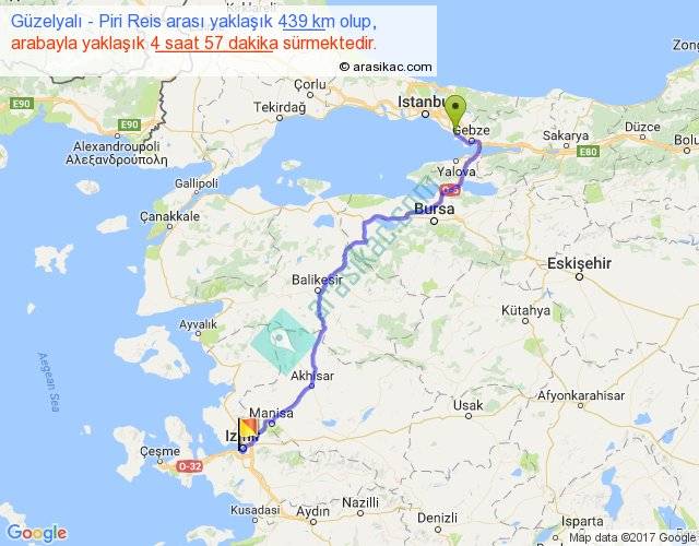 Güzelyalı - Piri Reis arası yaklaşık olarak 90 km/h ile yukarıda belirtilen sürede olup, iki yerin kuş uçuşu uzaklığı (mesafesi) 328'dir. Eğer belirtilen yerler arasında uçak seferi var ise bu süre uçakla 30 dakika'ya kadar düşebilir. Yolculuk otobüsle 6 saat 26 dakika sürmektedir.