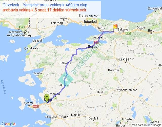 Güzelyalı - Yenişehir arası yaklaşık olarak 90 km/h ile yukarıda belirtilen sürede olup, iki yerin kuş uçuşu uzaklığı (mesafesi) 359'dir. Eğer belirtilen yerler arasında uçak seferi var ise bu süre uçakla 33 dakika'ya kadar düşebilir. Yolculuk otobüsle 6 saat 52 dakika sürmektedir.