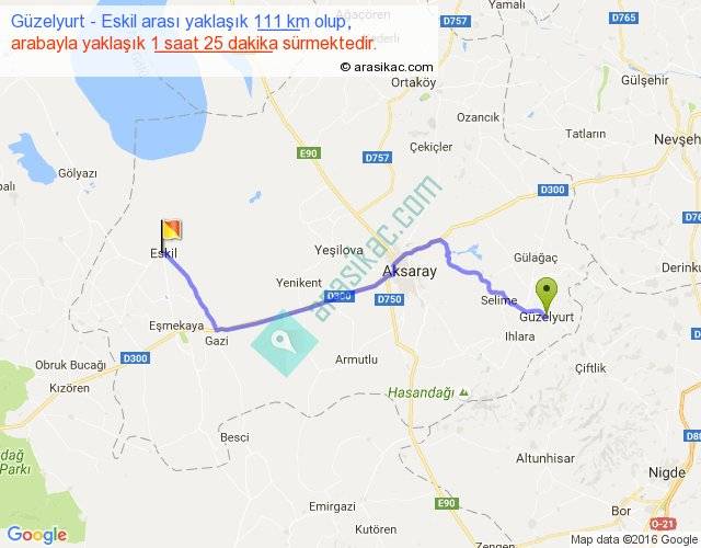 Güzelyurt - Eskil arası yaklaşık olarak 90 km/h ile yukarıda belirtilen sürede olup, iki yerin kuş uçuşu uzaklığı (mesafesi) 84'dir. Yolculuk otobüsle 1 saat 50 dakika sürmektedir.