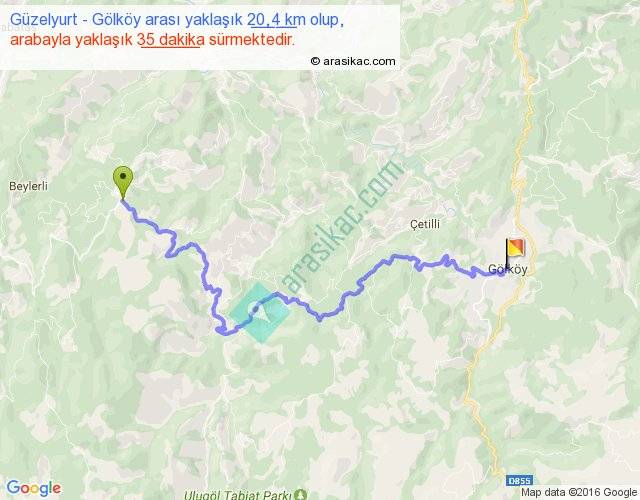 Güzelyurt - Gölköy arası yaklaşık olarak 90 km/h ile yukarıda belirtilen sürede olup, iki yerin kuş uçuşu uzaklığı (mesafesi) 11'dir. Yolculuk otobüsle 45 dakika sürmektedir.