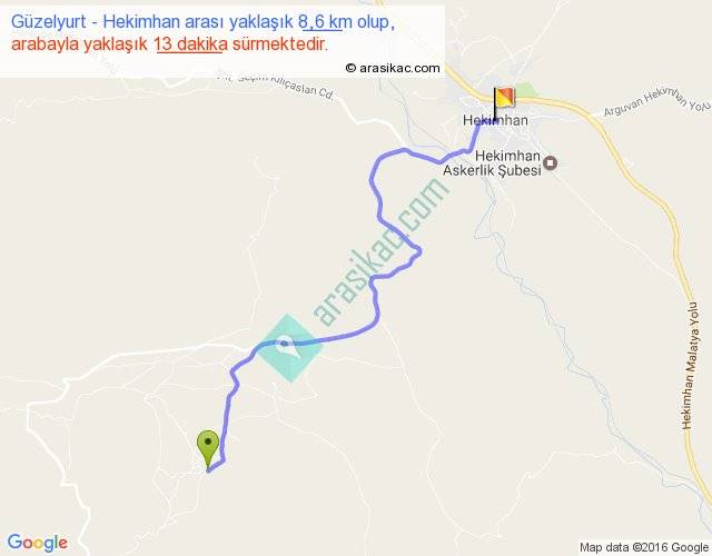 Güzelyurt - Hekimhan arası yaklaşık olarak 90 km/h ile yukarıda belirtilen sürede olup, iki yerin kuş uçuşu uzaklığı (mesafesi) 6'dir. Yolculuk otobüsle 16 dakika sürmektedir.