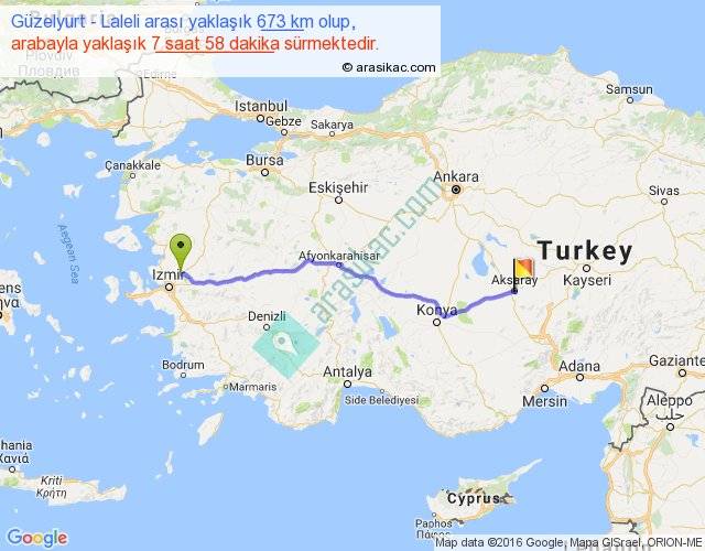 Güzelyurt - Laleli arası yaklaşık olarak 90 km/h ile yukarıda belirtilen sürede olup, iki yerin kuş uçuşu uzaklığı (mesafesi) 577'dir. Eğer belirtilen yerler arasında uçak seferi var ise bu süre uçakla 53 dakika'ya kadar düşebilir. Yolculuk otobüsle 10 saat 21 dakika sürmektedir.