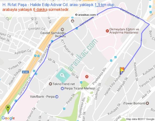 H. Rıfat Paşa - Halide Edip Adıvar Cd. arası yaklaşık olarak 90 km/h ile yukarıda belirtilen sürede olup, iki yerin kuş uçuşu uzaklığı (mesafesi) 1'dir. Yolculuk otobüsle 7 dakika sürmektedir.