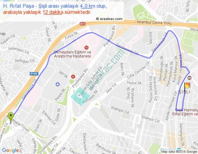 H. Rıfat Paşa - Şişli arası yaklaşık olarak 90 km/h ile yukarıda belirtilen sürede olup, iki yerin kuş uçuşu uzaklığı (mesafesi) 2'dir. Yolculuk otobüsle 15 dakika sürmektedir.