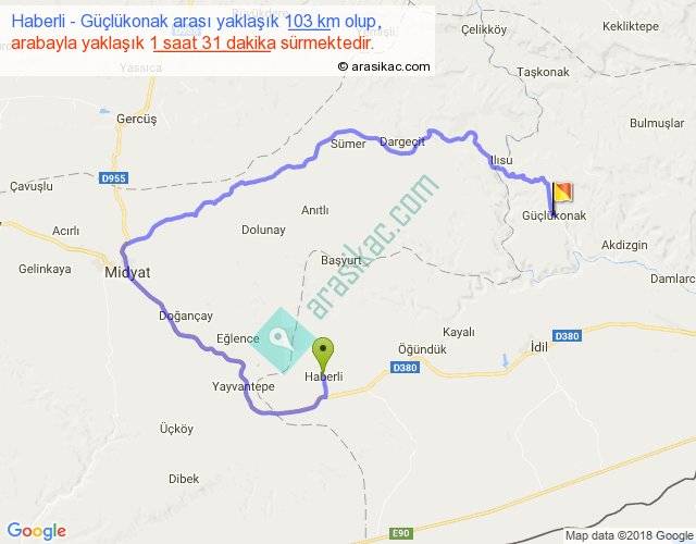 Haberli - Güçlükonak arası yaklaşık olarak 90 km/h ile yukarıda belirtilen sürede olup, iki yerin kuş uçuşu uzaklığı (mesafesi) 31'dir. Yolculuk otobüsle 1 saat 58 dakika sürmektedir.