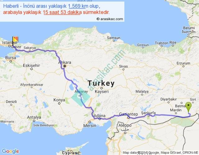 Haberli - İnönü arası yaklaşık olarak 90 km/h ile yukarıda belirtilen sürede olup, iki yerin kuş uçuşu uzaklığı (mesafesi) 1138'dir. Eğer belirtilen yerler arasında uçak seferi var ise bu süre uçakla 1 saat 45 dakika'ya kadar düşebilir. Yolculuk otobüsle 20 saat 38 dakika sürmektedir.