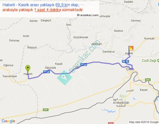 Haberli - Kasrik arası yaklaşık olarak 90 km/h ile yukarıda belirtilen sürede olup, iki yerin kuş uçuşu uzaklığı (mesafesi) 50'dir. Yolculuk otobüsle 1 saat 23 dakika sürmektedir.