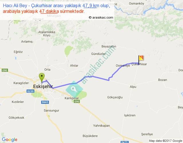 Hacı Ali Bey - Çukurhisar arası yaklaşık olarak 90 km/h ile yukarıda belirtilen sürede olup, iki yerin kuş uçuşu uzaklığı (mesafesi) 40'dir. Yolculuk otobüsle 1 saat 1 dakika sürmektedir.