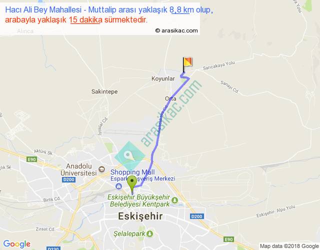 Hacı Ali Bey Mahallesi - Muttalip arası yaklaşık olarak 90 km/h ile yukarıda belirtilen sürede olup, iki yerin kuş uçuşu uzaklığı (mesafesi) 8'dir. Yolculuk otobüsle 19 dakika sürmektedir.
