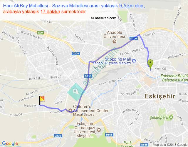 Hacı Ali Bey Mahallesi - Sazova Mahallesi arası yaklaşık olarak 90 km/h ile yukarıda belirtilen sürede olup, iki yerin kuş uçuşu uzaklığı (mesafesi) 6'dir. Yolculuk otobüsle 22 dakika sürmektedir.