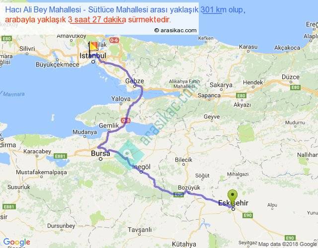 Hacı Ali Bey Mahallesi - Sütlüce Mahallesi arası yaklaşık olarak 90 km/h ile yukarıda belirtilen sürede olup, iki yerin kuş uçuşu uzaklığı (mesafesi) 193'dir. Yolculuk otobüsle 4 saat 29 dakika sürmektedir.