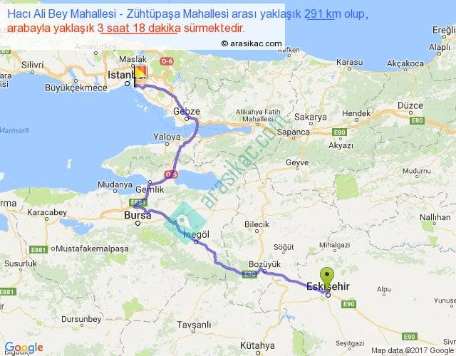 Hacı Ali Bey Mahallesi - Zühtüpaşa Mahallesi arası yaklaşık olarak 90 km/h ile yukarıda belirtilen sürede olup, iki yerin kuş uçuşu uzaklığı (mesafesi) 183'dir. Yolculuk otobüsle 4 saat 17 dakika sürmektedir.